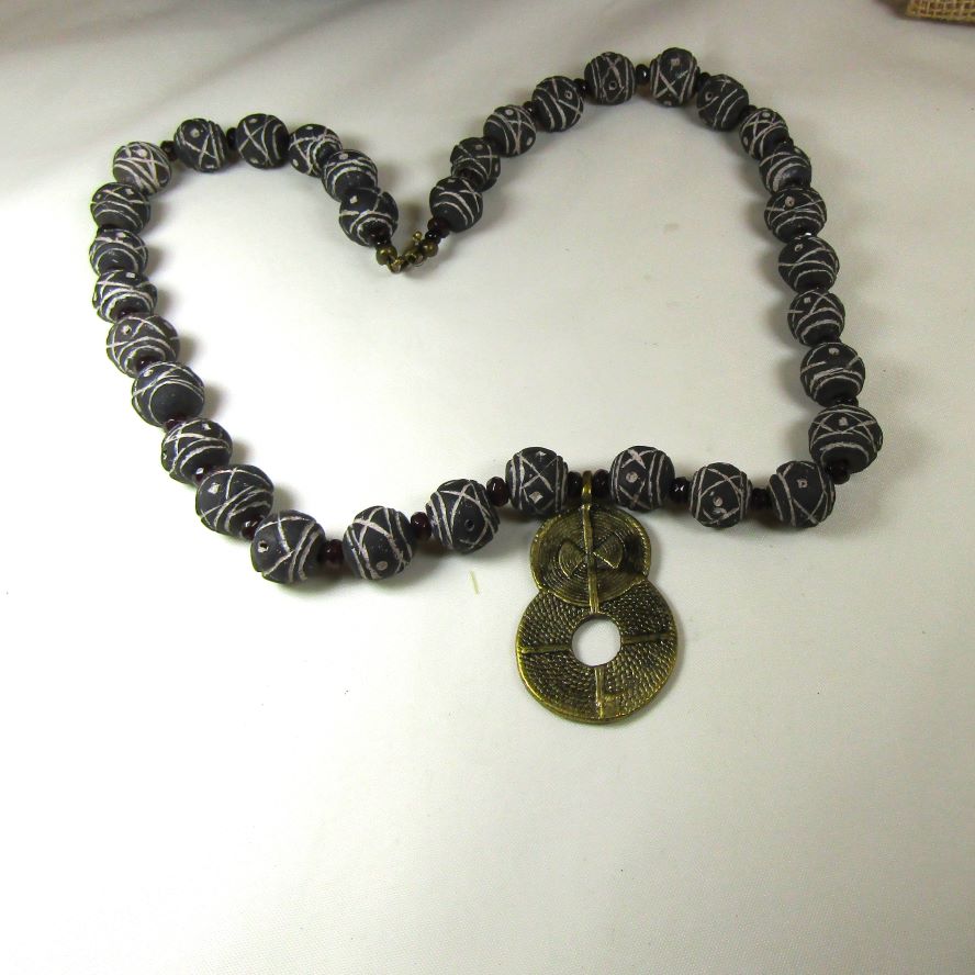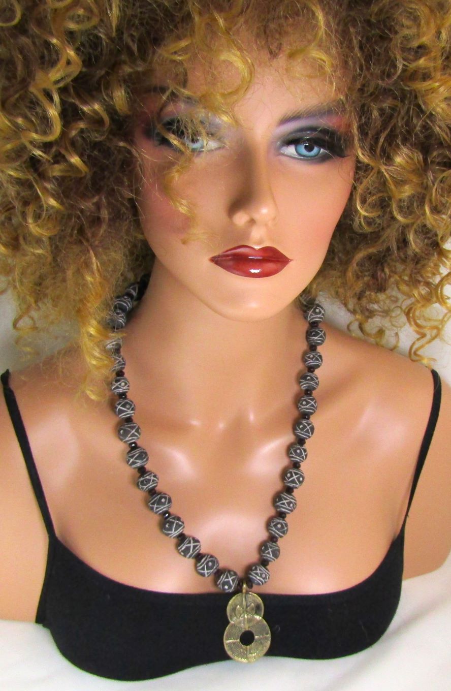 Feel the timeless sophistication of this beautiful Terracotta Black Beaded Necklace Brass Pendant. Its black beads and brass pendant make it perfect for any occasion, and the unique design ensures you'll always stand out in the crowd. Extra length.