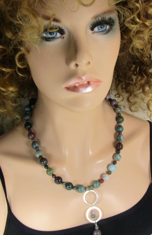 This 18 inch handcrafted Indian Agate Necklace features Indian Agate gemstone beads. This handmade necklace has a pendant of two sterling silver rings accented with agate beads for a 3 inch drop. This handmade gemstone pendant necklace is finished with a sterling silver hook and eye clasp. Indian agate beads used in this handmade gemstone pendant necklaces are multi-colored ranging in dark green to grayish pink to aqua. Very competitive price for an agate necklace. You love this agate gemstone pendant necklace as a go to accessory for the office. The multicolored gemstone of this necklace pair with any of your black, brown, green or beige outfits. Great rich fall colors and sterling silver make this a must have addition to your accessory collection. You can't bet the price to top quality agate jewelry anywhere else.