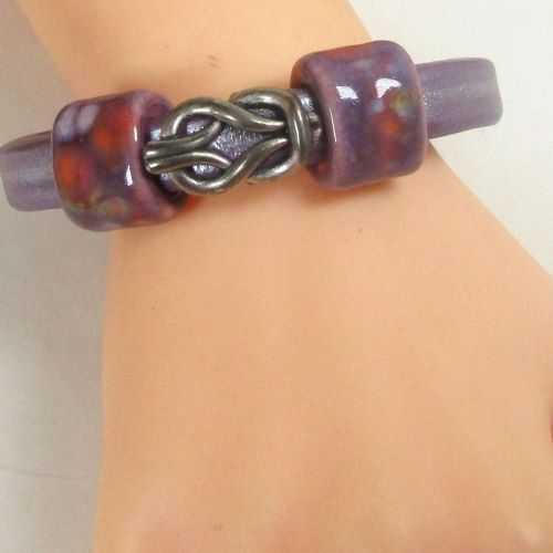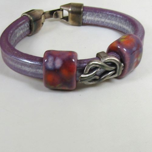 A iridescent lilac thick leather cord bracelet accented with lilac and orange ceramic beads. This classic leather 8 inch bracelet features 10 by 6mm regaliz Greek leather bracelet accented with Clay River lilac and orange handmade ceramic slides and silver focus. A hook and eye clasp completes this lilac leather bracelet. Sporty look with pizzazz. Great for office wear but casual enough for every day. This lilac real leather cord bracelet with lilac ceramic accents is a great choice for that fun bracelet.