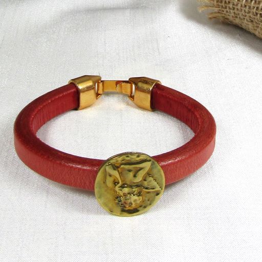 This orange red licorice leather bracelet features a 7/8 inch gold coin with an angel motif and a thick regaliz leather bracelet A gold plated hook clasp completes this 8 inch licorice leather bracelet. Whimsical and sweet Very classic style in a red leather bracelet sized for the 7 inch wrist. This very affordable leather bracelet makes a great gift. Regaliz leather bracelets like this re leather bracelet are all the rage in Europe.
