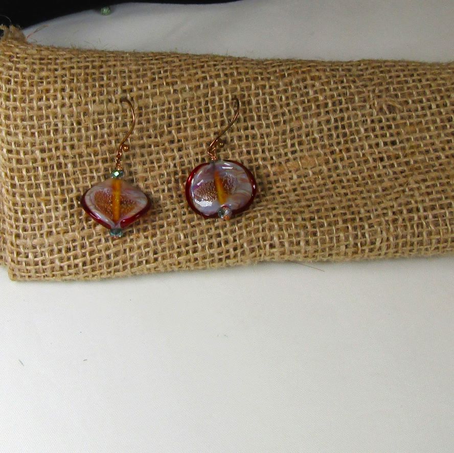 These unique handmade artisan bead earrings feature golden boro Spanish dancers beads accented tiny Czech crystals. Eye catching design with lots of sparkle make this golden artisan earrings a great choice. Boro glass is known as hard glass and is very costly to make, but the finished product is gorgeous.