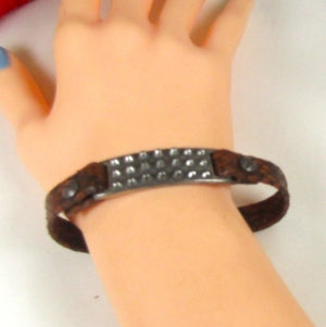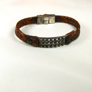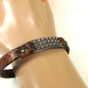 Snakeskin and a hob nail ID plate makes this a great look in a man's leather bracelet. A magnetic clasp completes this snakeskin leather bracelet for a man. Treat your guy or yourself to this affordable accessory. This man's brown leather bracelet comes in 2 sizes: 7 3/4 inch designed to fit up to 7 1/2 inch wrist and 8 1/4 inch designed to fit up to a 8 inch wrist. An affordable accessory in a brown leather bracelet