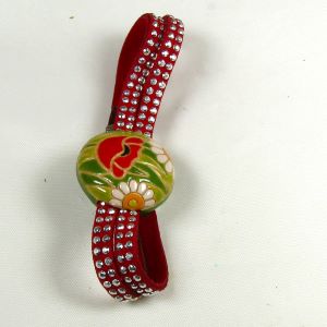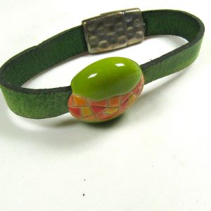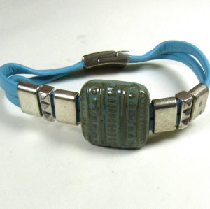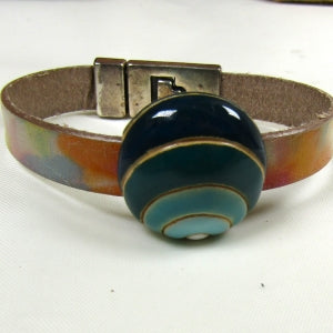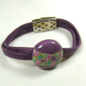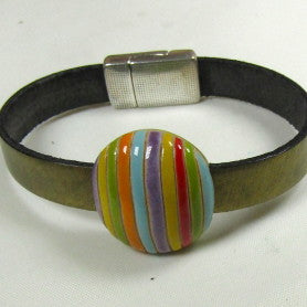 Leather women's bracelet with a Golem Studio unique handmade ceramic slide comes in an assorted colors [red, line green, antique gold, black, lilac, pastel & blue]. A magnet clasp finishes the 7 1/4 to 7 1/2 inch leather cord bracelet. This bracelet is designed to fit up to a 6 3/4 inch wrist. This Flat leather women's bracelet is a great buy.