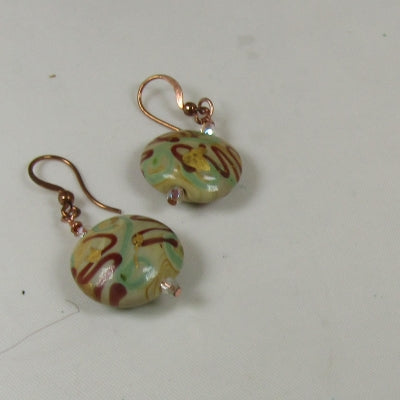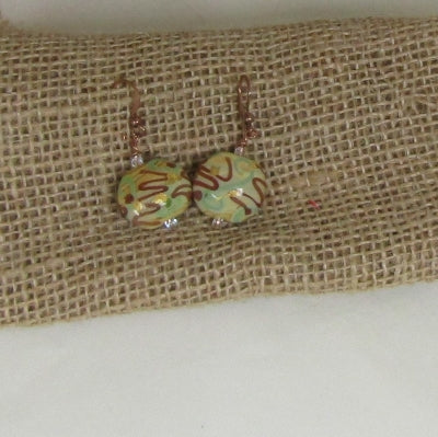 These handcrafted earrings feature handmade artisan coins. Copper french ear wires complete these delightful green handmade drop earrings. These earring drop 1 inch. Handcrafted in the USA. The perfect accent. Works for both office and weekend.