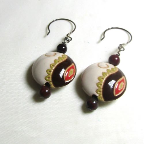 Ivory, black & Red round earrings feature handmade Golem beads in a paisley pattern of ivory, olive & brown accented with tiny brown gemstone beads
