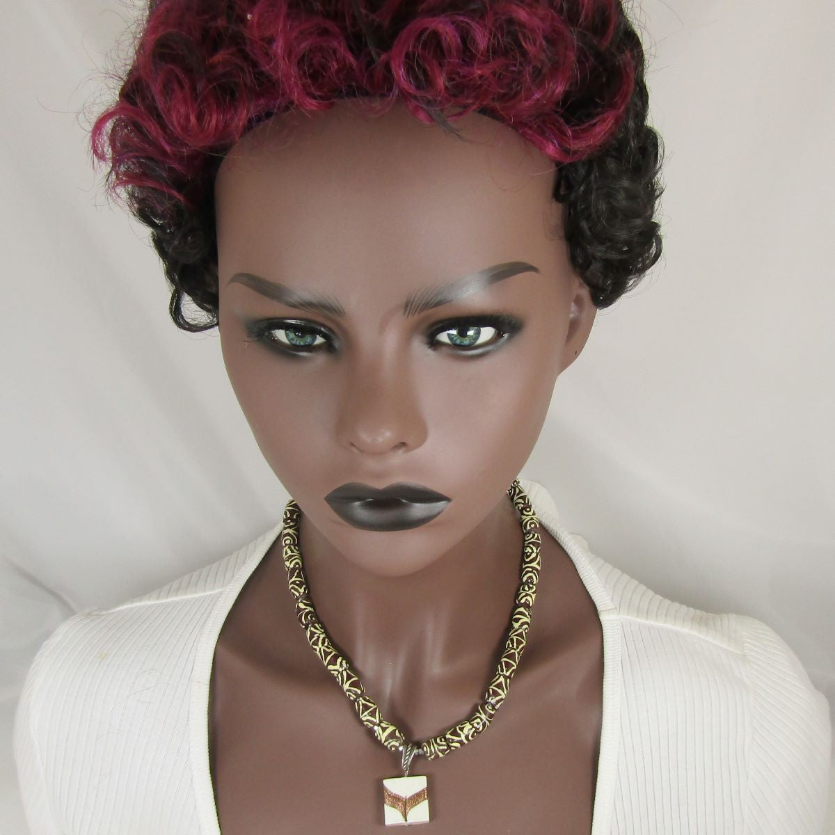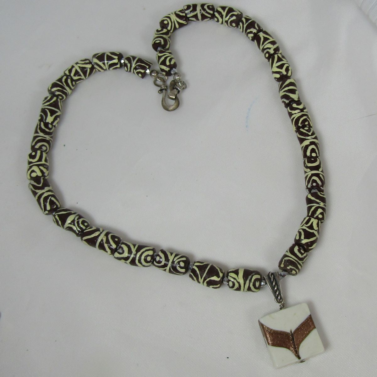 This casual necklace feature African zen Kroba Ghana beads accented with tiny crystal beads & a handmade Venetian square pendant. The pendant with sterling silver bail drops 1". A sterling silver hook & eye clasp completes this 18 1/2" necklace. Great choice for the office or lunch with friends.