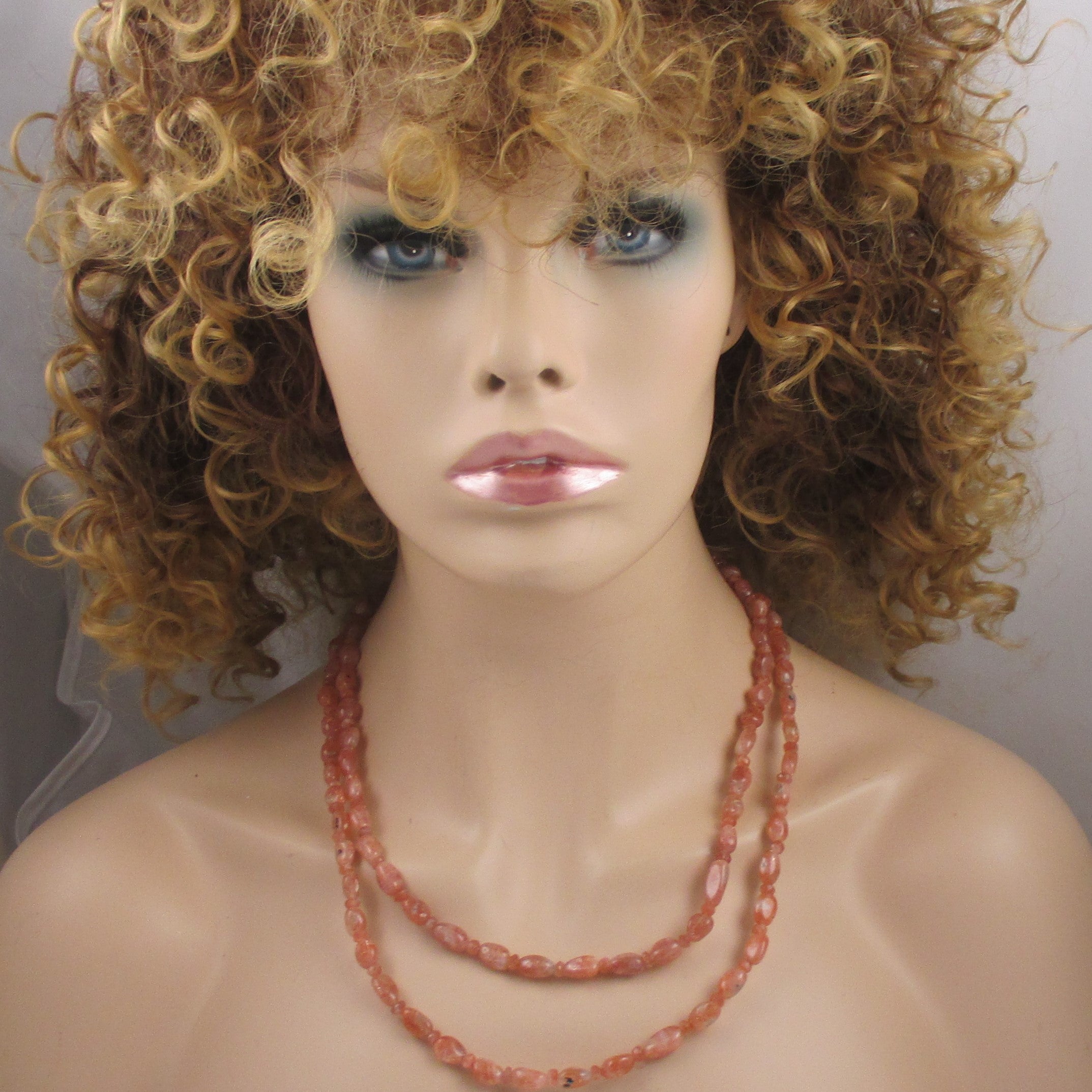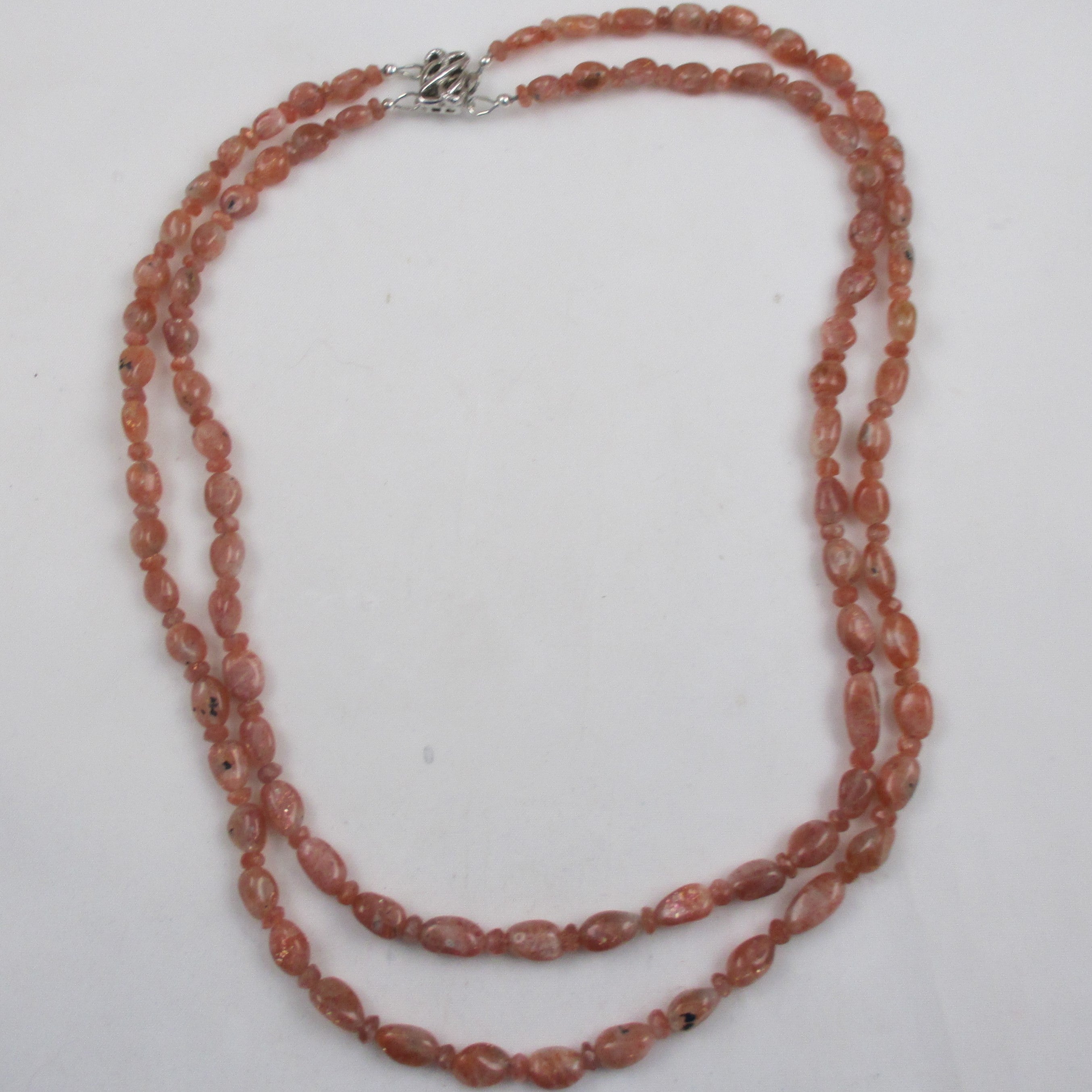 This sunstone beaded double strand necklace offers you a one of a kind designer necklace. A rhodium box clasp finishes this 19 to 23" necklace. A sophisticated look for the office. A perfect accessory for our black business suit. Equal alluring with a black leather skirt and simple blouse at dinner with friends at the local Bistro.