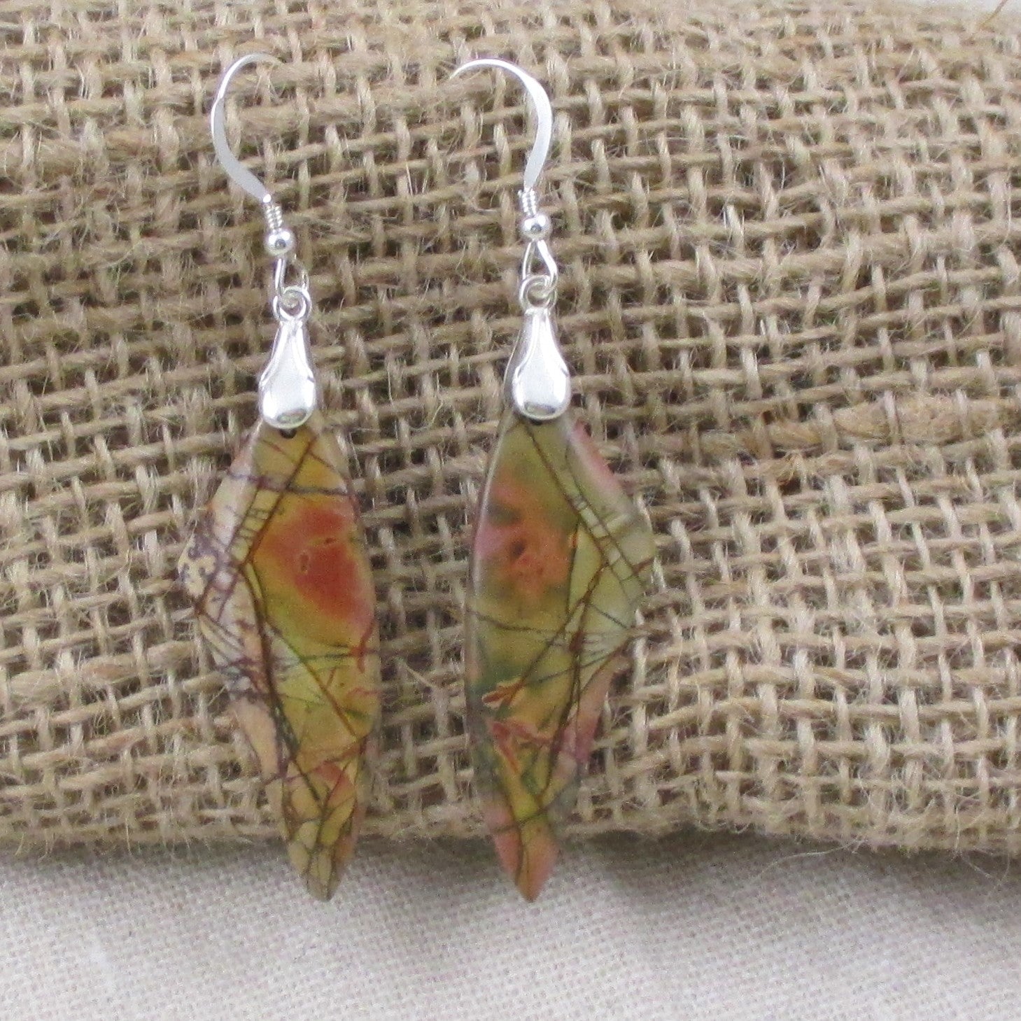These earrings are unique designer cut red creek jasper cabochons in shades of brown with vines of beige & red. Gemstone earrings are always a great choice for the office or for dinner with friends at your local bistro.