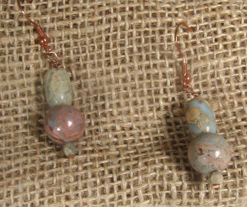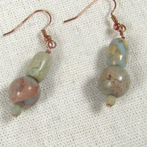 These jasper earrings features smokey aqua snake skin jasper beads. These gemstone earrings drop 1 inch from copper french ear wires. These earrings are great addition to your office wardrobe