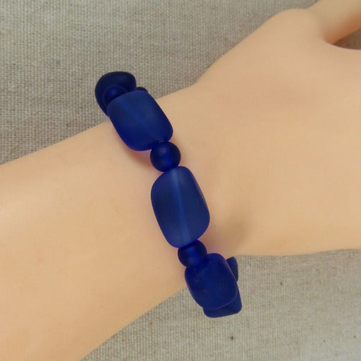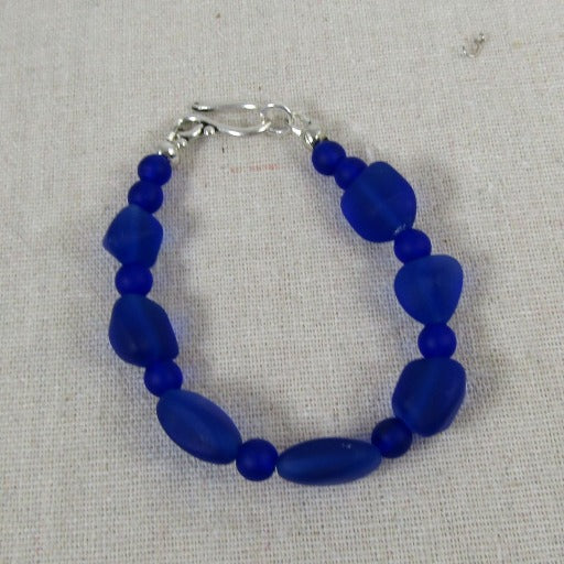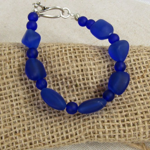 This classic bracelet features recycled royal blue sea glass bead. A silver plated hook & eye clasp completes this 7 1/2" bracelet. Fits up to a6 6 3/4" wrist.. Special occasion quality everyday price.