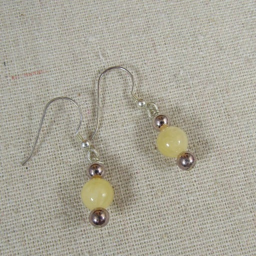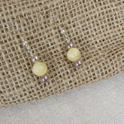 These earrings feature Mellite (honey stone) gemstone beads accented with small brown pearl beads. These delicate gemstone earrings drop 1" from sterling silver ear wires.