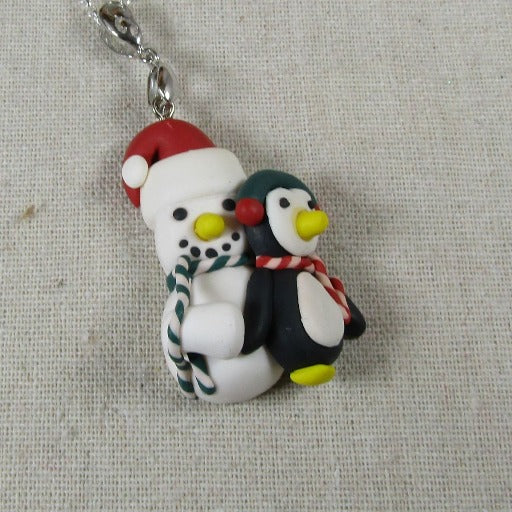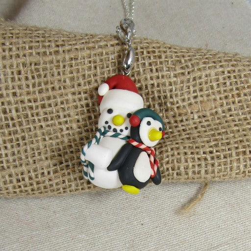This pendant necklace features a cute snowman & penguin pendant. It drops 2 1/2" from an 20" silver plated chain. great for Casual Friday during the holiday.