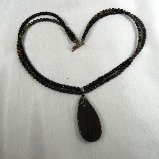 This beautiful Tigeriron Gemstone Pendant Necklace features an eye-catching gemstone pendant for a stylish look. Black beaded necklace adds a classic touch, perfect for any occasion.