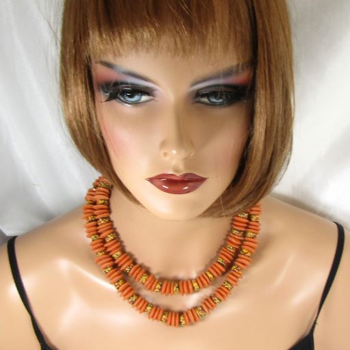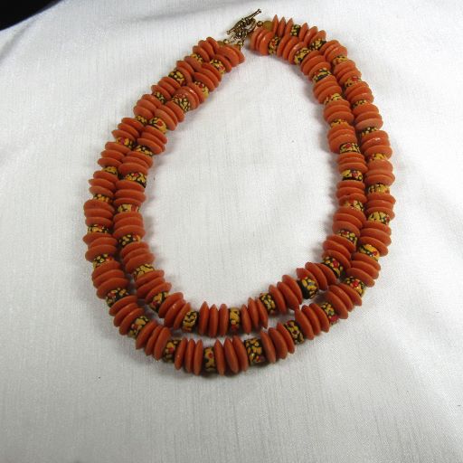 Featuring intricate African trade beads, this beaded necklace offers a luxurious and sophisticated style that will elevate any ensemble. With its vibrant orange hue and unique double-strand design, it is sure to become a treasured piece of jewelry.