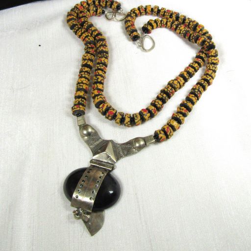 This opulent pendant necklace features a bold blend of black, red and gold African Trade beads, creating an eye-catching and luxurious look. Crafted with intricate details, the black pendant exudes a touch of sophistication and timeless style.