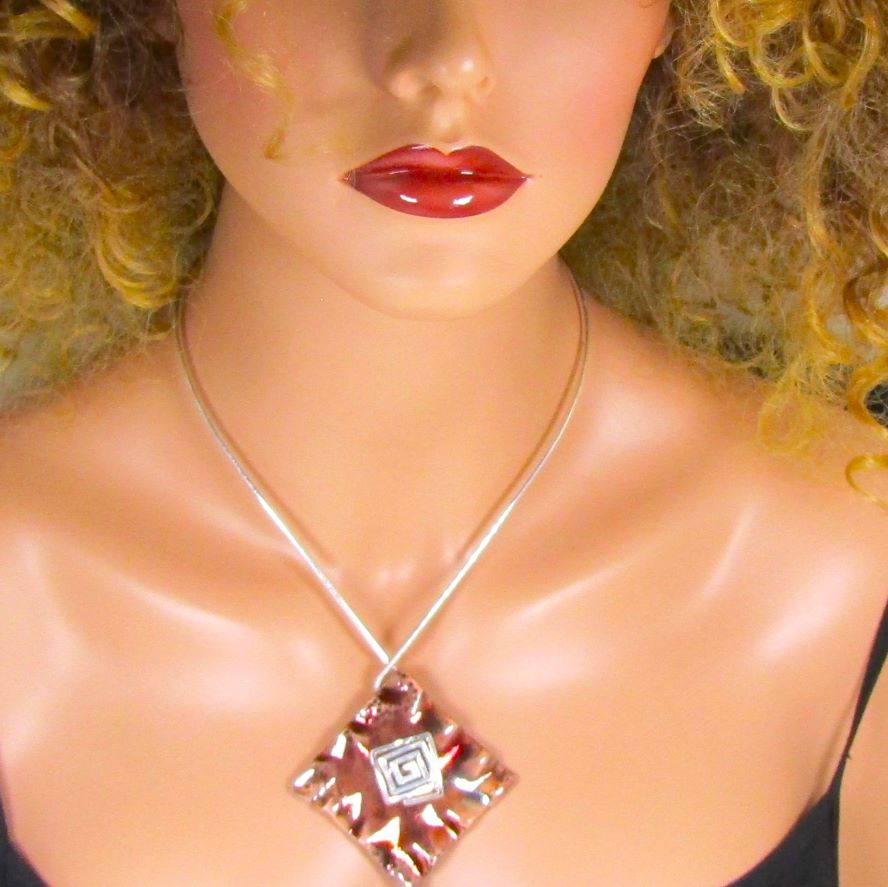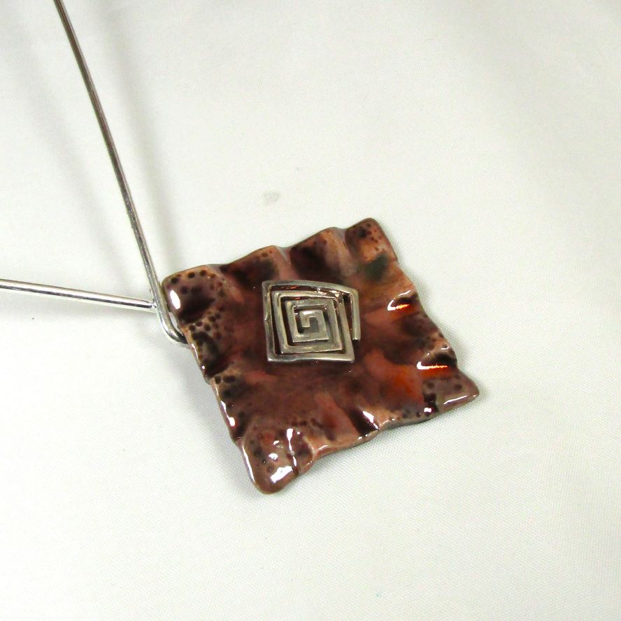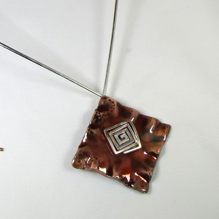 This unique handmade necklace is a real knock out. Outstanding look whether in the board room or at a sports bar. This square orange wash handmade ceramic pendant [raku glaze] on neck wire is a sophisticated choice for the office. Great buy on a handmade artist signed handmade jewelry. Very classic handmade urban raku pendant [make in USA] necklace. Urban raku finish on this round pendant was created by the uses of a 16th century Japanese technique that takes several days high heat firing to achieve.